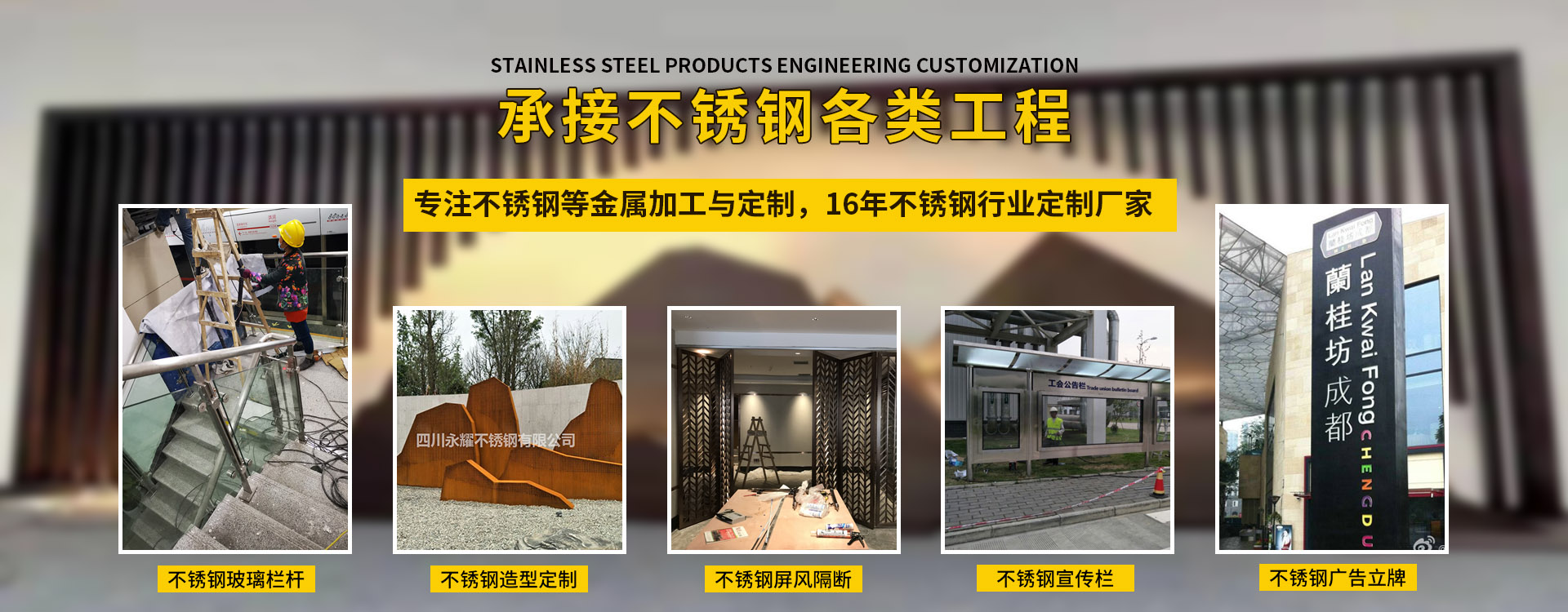 四川永耀不銹鋼有限公司是一家集開發(fā)、設(shè)計(jì)、加工、制作、安裝、并承接各種不銹鋼工程為一體的綜合性企業(yè)。多年來一直在專注于不銹鋼等金屬的加工與研發(fā)。在客戶群體中贏得了良好的聲譽(yù),以專業(yè)專注的精神,致辭力于打造良好的產(chǎn)品和企業(yè)形象,對(duì)每一產(chǎn)品傾注全力,力爭(zhēng)每個(gè)細(xì)節(jié)精細(xì),確保產(chǎn)品具有優(yōu)越的性能,優(yōu)美的外觀及優(yōu)良的品質(zhì),使公司產(chǎn)品深受廣大用戶的親睞。